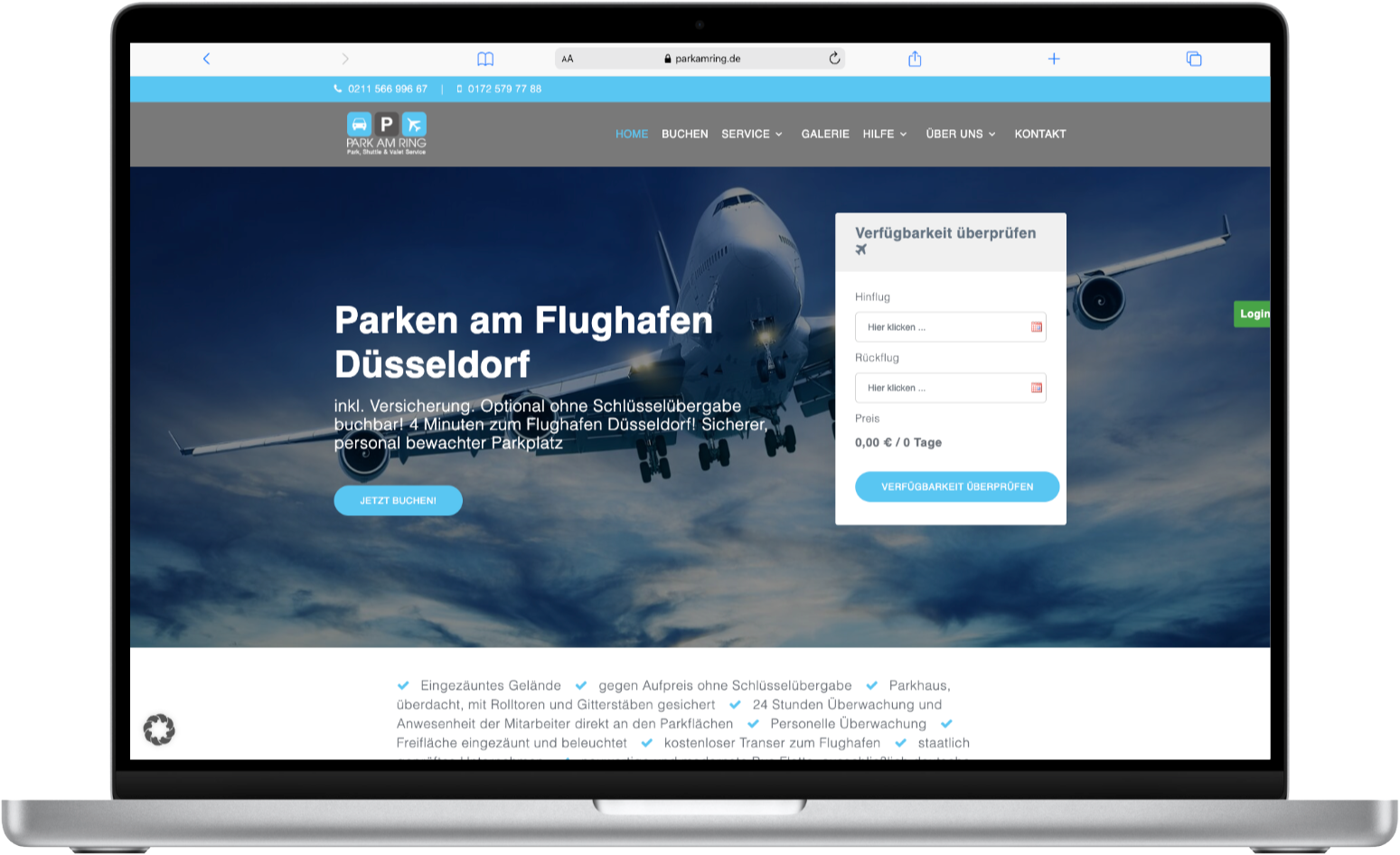 Park am Ring bietet sicheres und günstiges Parken am Flughafen Düsseldorf: Ihr Fahrzeug steht auf einem videoüberwachten, beleuchteten und personalbewachten Parkplatz. Sie wählen zwischen kostenlosem Shuttle-Service zum Terminal oder komfortablem Valet-Parking mit Übergabe direkt am Flughafen. Zusätzliche Leistungen wie Fahrzeugwäsche sind optional buchbar. Sorgenfrei starten Sie so in Ihre Reise und finden Ihr Auto bei der Rückkehr wieder bereit.